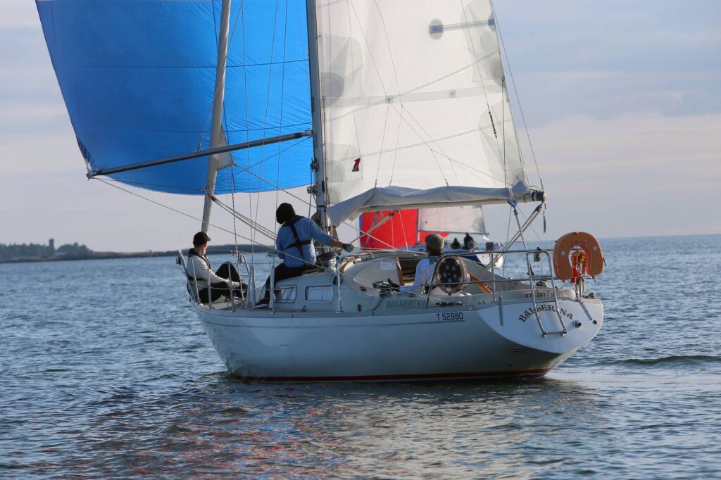 Liian nopeassa käännöksessä gasti ei ehdi vetää genuaa ohi rustien, joista yksi sijoittuu selvästi mastoa edemmäksi. Babystay onneksi puuttuu, joten pakkaavanakin genua siirtyy kyllä lopulta uuden halssin puolelle. Mutta jos se pääsee täyttymään ennen sisään jalustamista, gastilta vaaditaan melkoisesti voimaa, vaikka apuna on peräti 40-kertoimen vinssi. Se oli iso 1970-luvulla (oikeastaan vieläkin) ja muistuttaa Balladin sporttisista juurista.