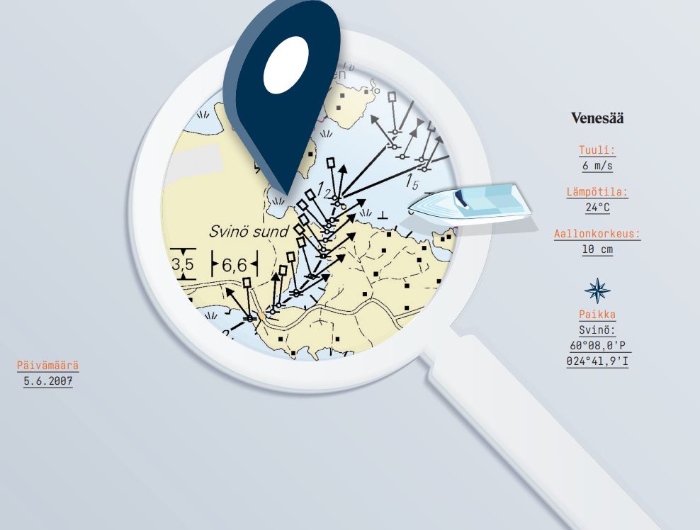 Nuoret olivat lähteneet Suomenojalta (vihreä ympyrä) kohti Stora Herrön aluetta (sininen ympyrä). Lopulta heidät löydettiin Svinön salmesta (punainen piste). Sami ja Mari olivat ankkuroituneet Svinön salmen pohjoispuolella olevaan kaislikkoon.