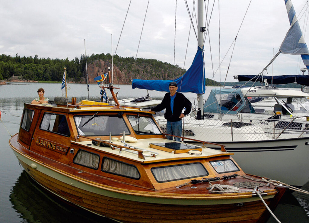 Notvikenin vieraslaituri myötäilee kauniisti jylhää kalliorantaa, jonka korkeimmalta kohdalta voi ihailla omaa venettään tai kadehtia toisten menopelejä harvinaisesta perspektiivistä, melkein kohtisuoraan ylhäältä. Heinäkuinen ilta laiturilla on täynnä elämää; kertakäyttögrillit savuavat, ruotsalaiset imeskelevät ikuisia katkarapujaan, joku sikafleksaa sadatellen vessan tiivisteitä. Vieressäni olevan puufiskarin kippari Matti Heimo Saara-vaimonsa kanssa siemailee kannella iltakahviaan. Hyvin hoidettu Albatros-niminen fiskari seilaa Kustavin Kippareiden lipun alla. Heimot eivät ole ensi kertaa pappia kyydissä.