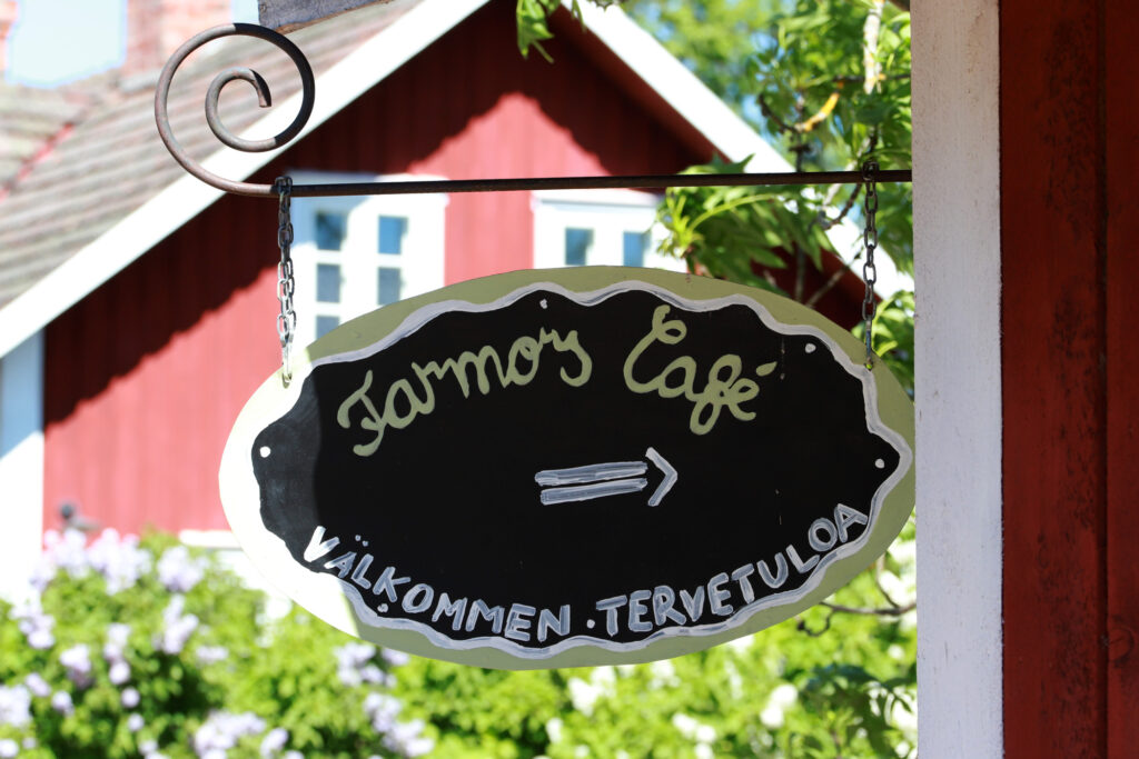 Monelle veneilijälle pääsyy tulla Högsåran saareen on legendaksi muodostunut kahvila Farmors Cafe. Siellä voi syödä herkullisen aterian tai nauttia kakkukahvit viihtyisässä puutarhassa. Pettymykseksemme kahvila on juhannukseen asti auki vain viikonloppuisin ja me olemme saaressa arkipäivänä 15. kesäkuuta. No, istumme Lillbackan laiturin kahvilaan ja tilaamme tapaksia ja lämpimiä juustovoileipiä.