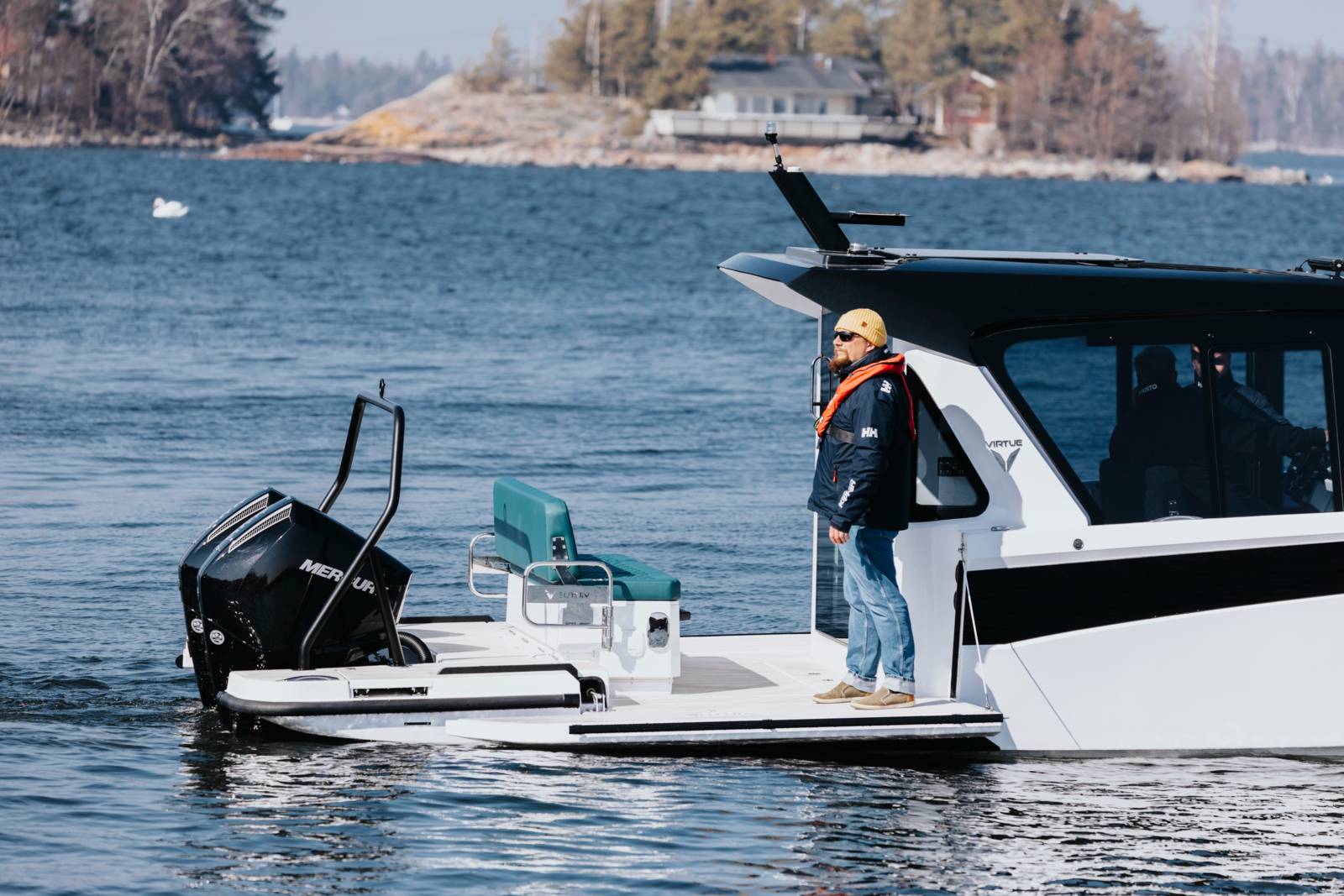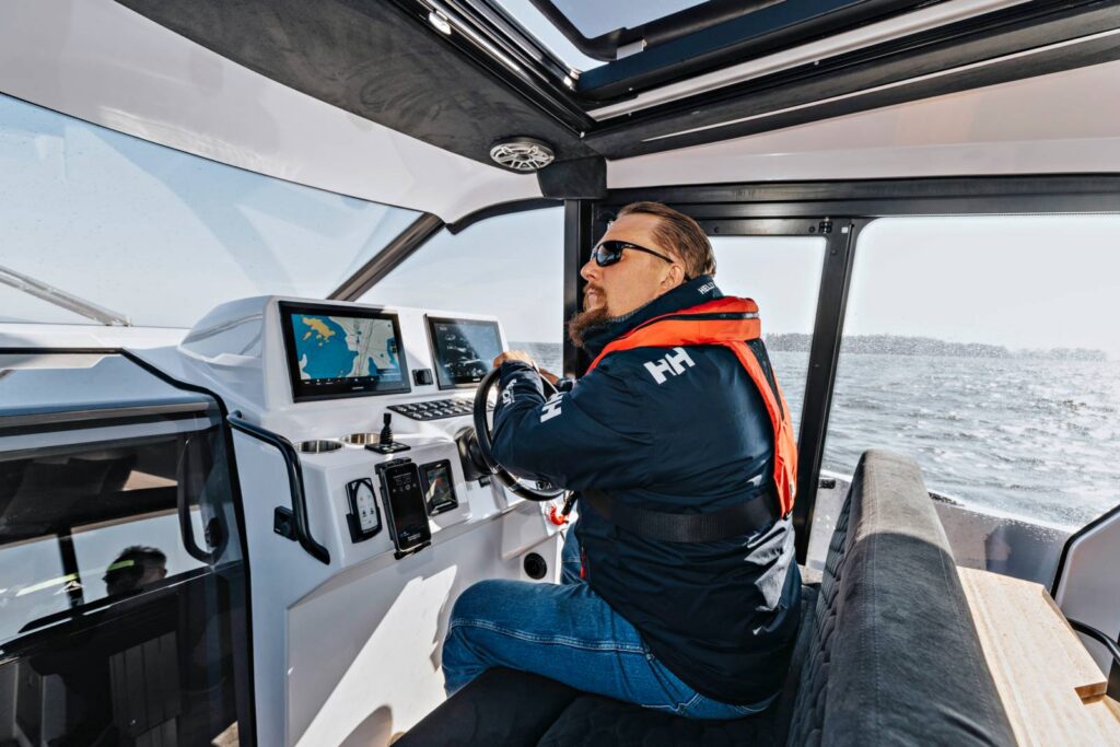 Suuret lasipinnat ympärillä avaavat keväisen saariston kuin tarjottimelle. Lasia on paljon, palkit ovat kapeita. Tunnelma on poikkeuksellisen avara. Liukuovet avautuvat kolmeen suuntaan tehden veneen operoinnin helpoksi myös yksin liikuttaessa. Ohjaamoergonomiakin on ihan mukiinmenevä.